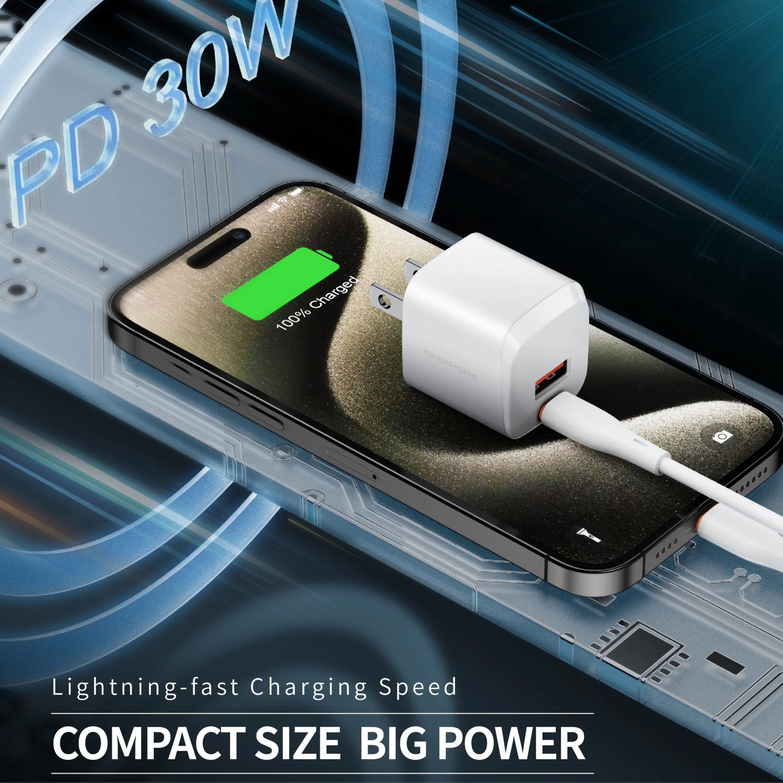 Adaptador de Pared Doble Puerto Keephone 30W: carga rápida PD, 50% en 30 min, tecnología GaN, compacto y seguro. ¡Optimiza tu carga hoy mismo!