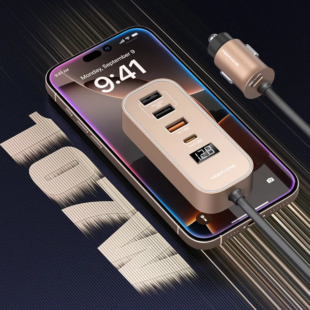 El cargador multi puerto REVAMP Keephone 107W es el accesorio indispensable para viajes en familia o trayectos largos, ofreciendo carga rápida, versatilidad y diseño en un solo producto.