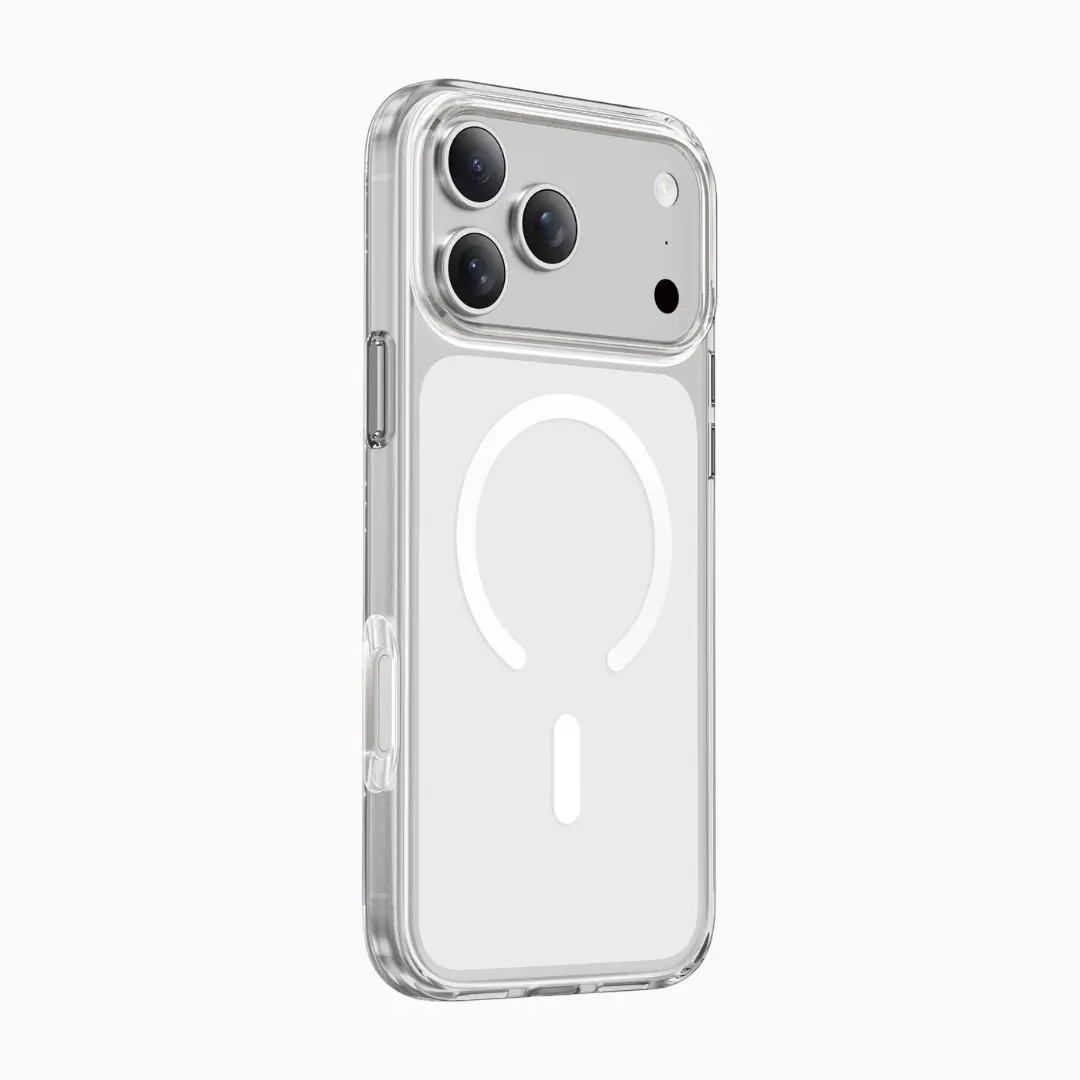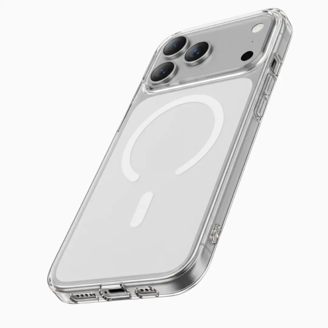 Descubre la REBECCA MagSafe Case para iPhone 17 Pro Max: ultra-slim, anti-amarilleo y con imanes N52 de 3500 Gauss. Funda clara MagSafe delgada con botones metálicos y protección total contra rayones.
