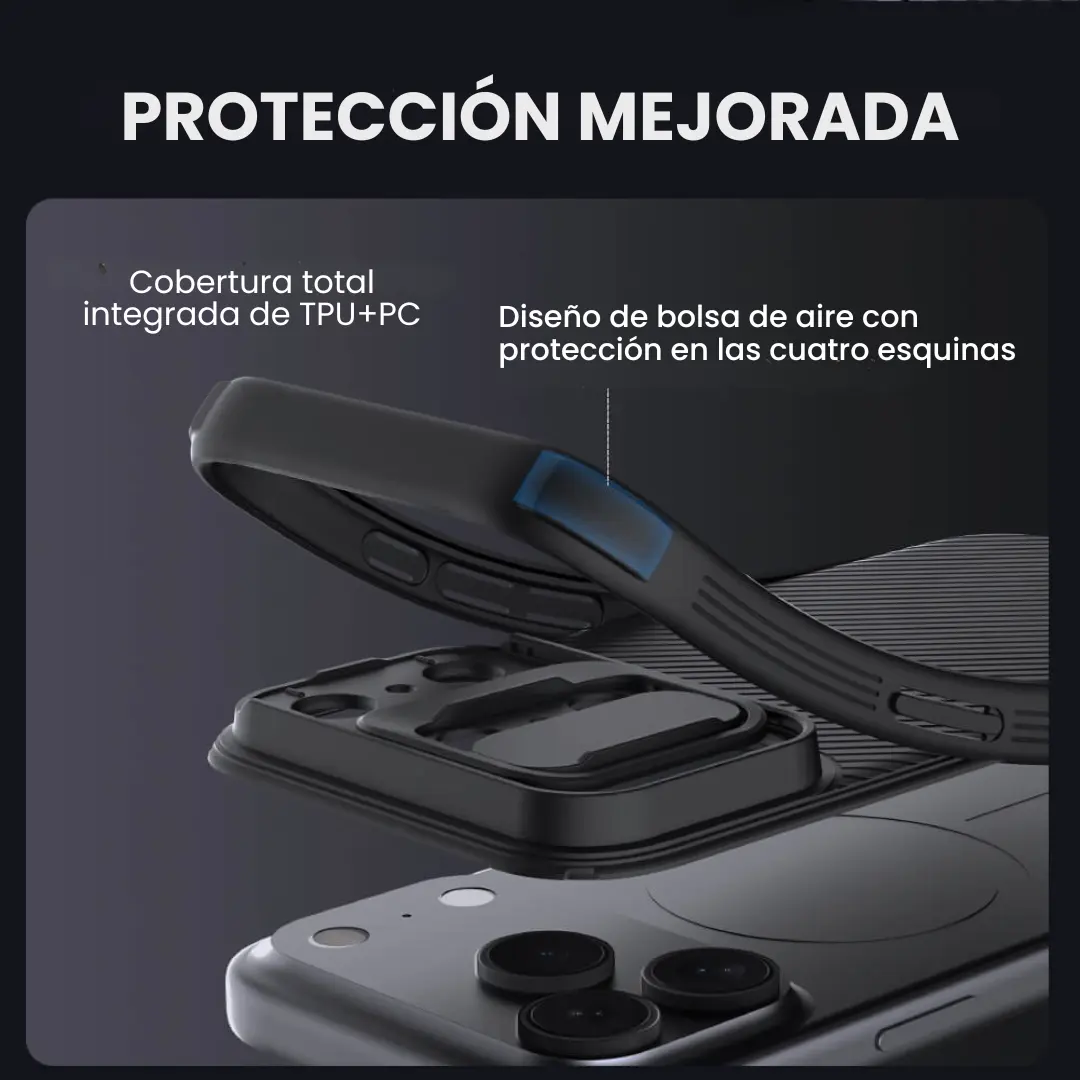 Su cubierta deslizante patentada protege la cámara de rayones y resguarda tu privacidad, mientras el sistema magnético permite conectar perfectamente con cargadores MagSafe y tarjeteros compatibles, asegurando funcionalidad sin perder eficiencia. La estructura de una sola pieza se ajusta perfectamente al iPhone, incluye airbags en las esquinas para absorber impactos y garantizar protección integral, además de ser anti-huellas y resistente a manchas.