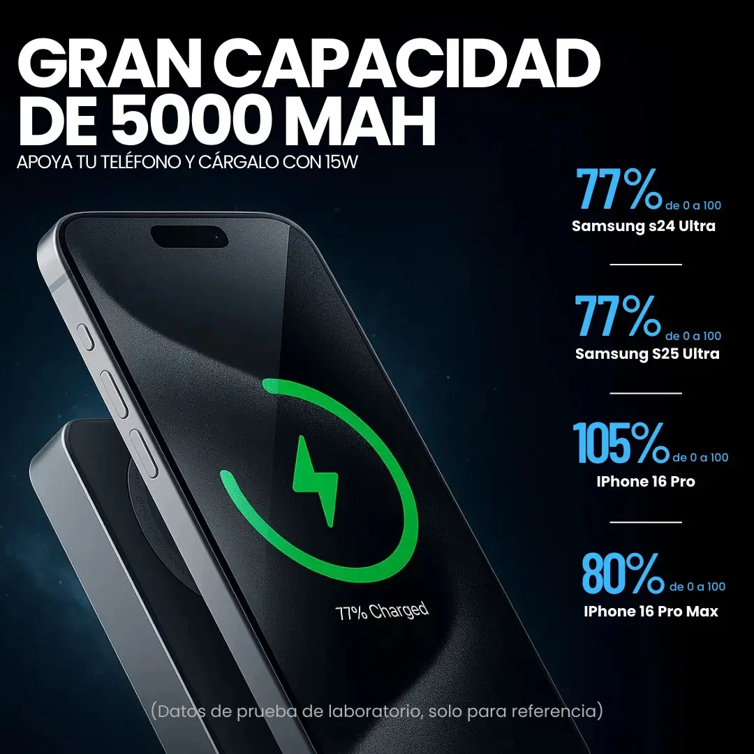 - Carga Rápida Inalámbrica: Ofrece carga inalámbrica de hasta 15W con una fuerte atracción magnética, permitiéndote cargar tus dispositivos sin complicaciones.