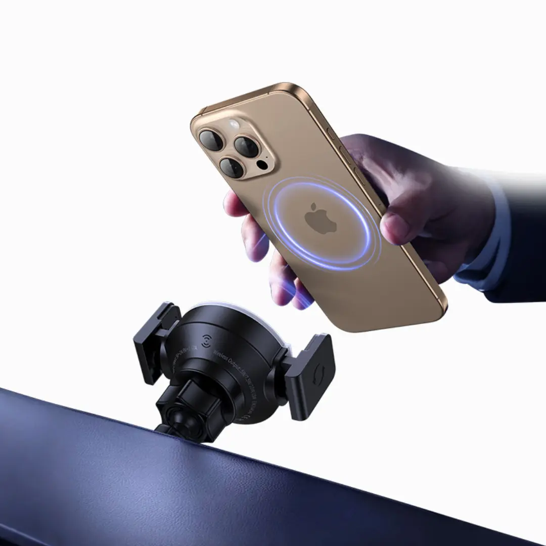 Optimiza tus viajes con el holder magnético para carro, que combina un diseño premium con funcionalidad avanzada para ofrecerte estabilidad, comodidad y carga inalámbrica rápida mientras conduces.