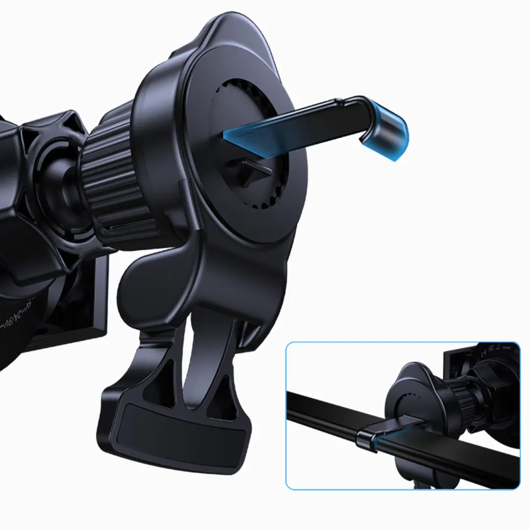 Holder magnético para carro con fibra aramida, luz LED, carga inalámbrica 15W, ajuste 360°, clip ajustable y gancho seguro para ventilación. Elegancia y funcionalidad.