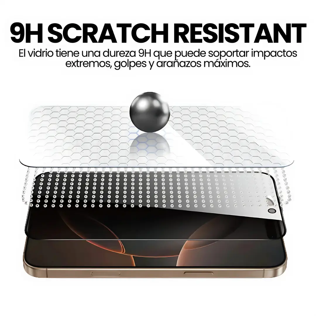 Vidrio antiespia Silicone Privacy para iPhone 17 Pro y iPhone 17 Pro Max: dureza 9H, borde 3D, filtro privacidad 26°, claridad óptica y protección total. Seguridad y estilo.