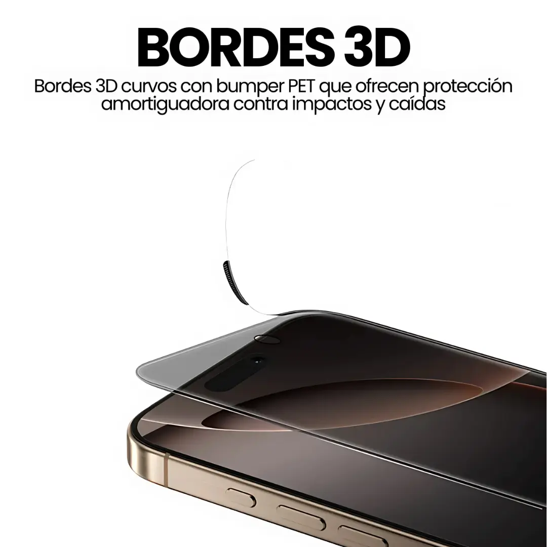 - Bordes 3D curvos con bumper PET que ofrecen protección amortiguadora contra impactos y caídas, cuidando también los bordes del dispositivo.